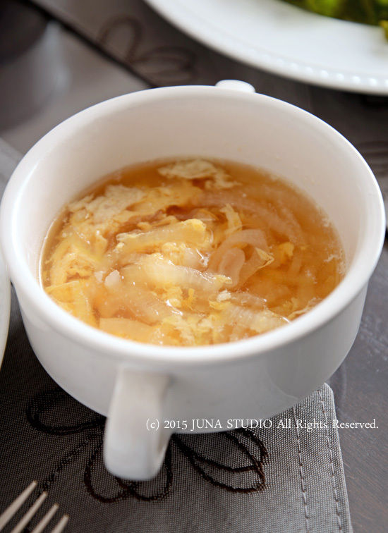 煮鶏の煮汁はとってもおいしいオニオン&卵のスープに変身♪