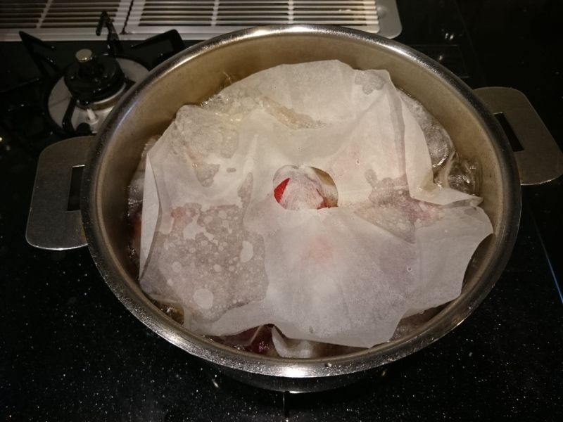 2.しばらくするとアクが出てくるので、アク取りシートを被せ、さらにオーブンシートで作った