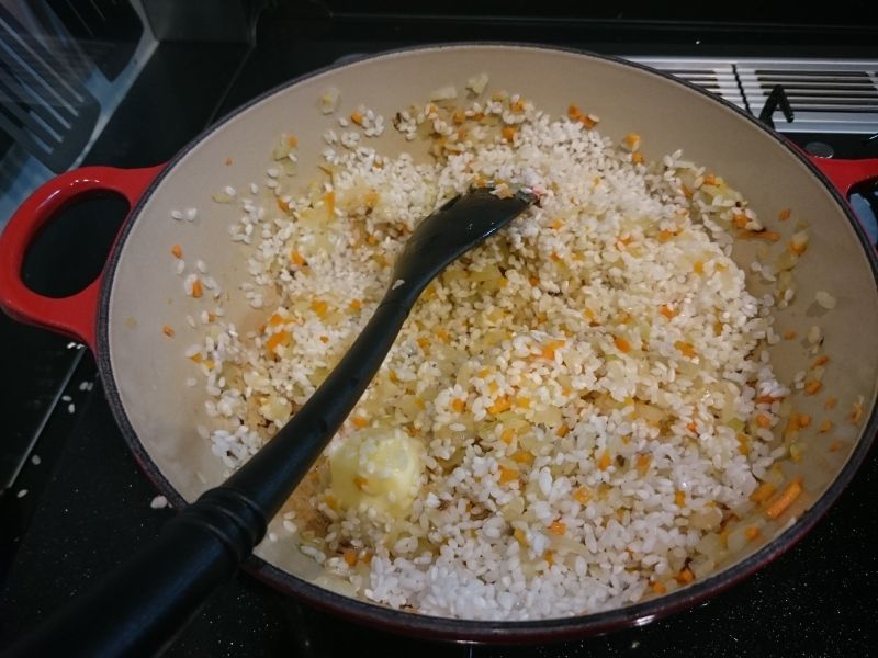 5.4に1の米、バターを加えてさらに炒め、水、塩を入れてさっとひと混ぜるす。