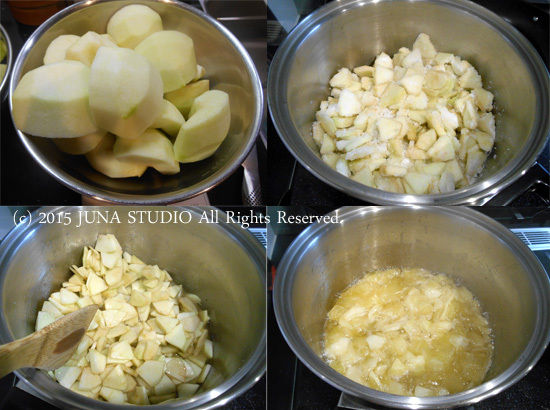 まずはクッキングアップル(大1個)の皮をのぞいて鍋に入れ、