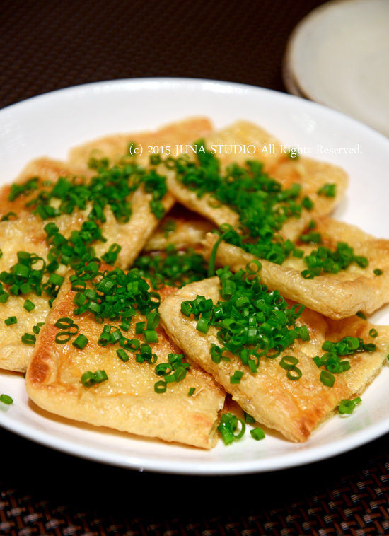 油揚げを鉄パンで両面こんがりと焼き(テフロンの場合は薄く油をひくとよい)、