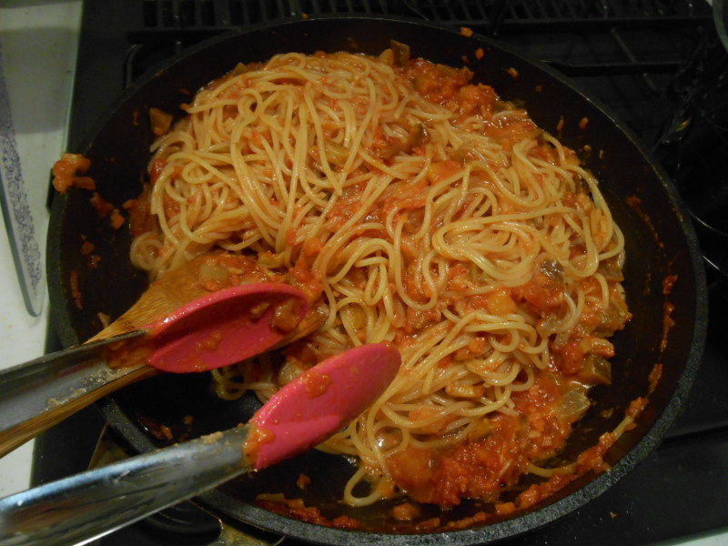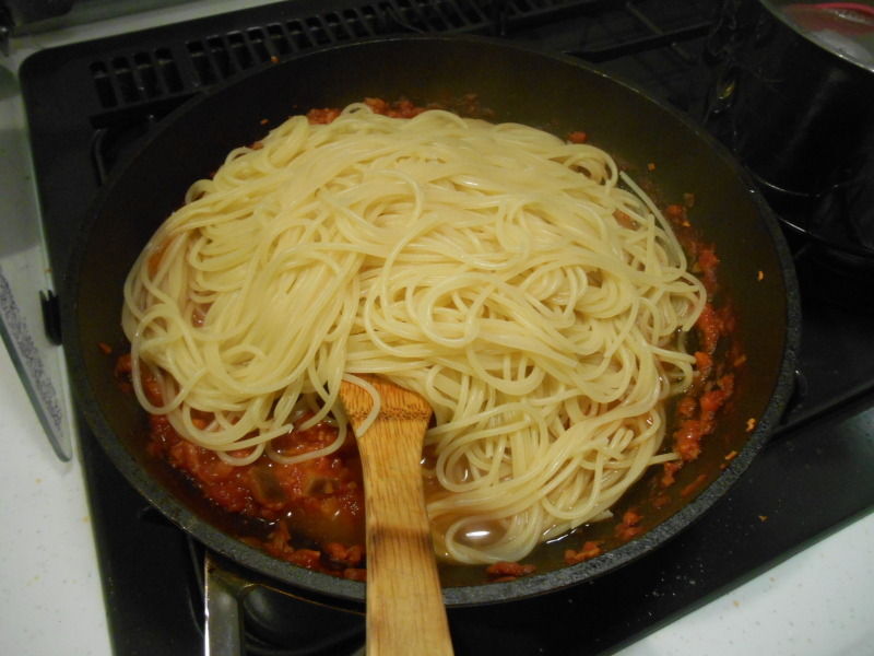 そのチーズがだいたい溶けたかなというところで、ゆでたパスタ(3人分)投入。
