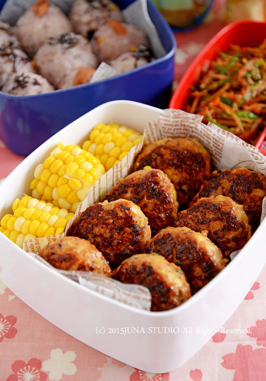 ごはんは、雑穀入りおこわ風のごはんを丸くにぎって詰めてます。