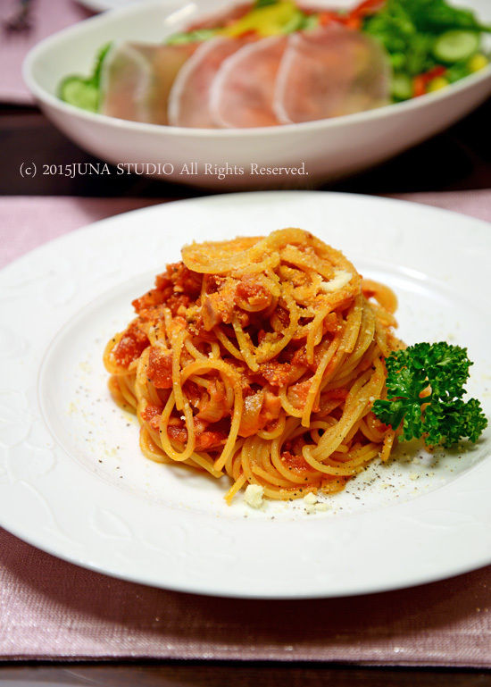 ボタっとした感じになったらゆであがったパスタを入れてなじませる。