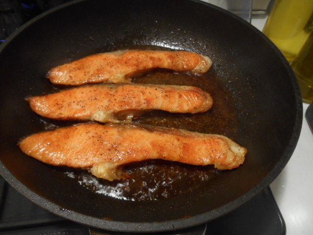アルコール分を飛ばしながら、時々鮭の上にスプーンなどでタレをかけながら、