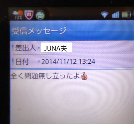 お昼過ぎに、JUNA夫さんからメールが来たのよ。