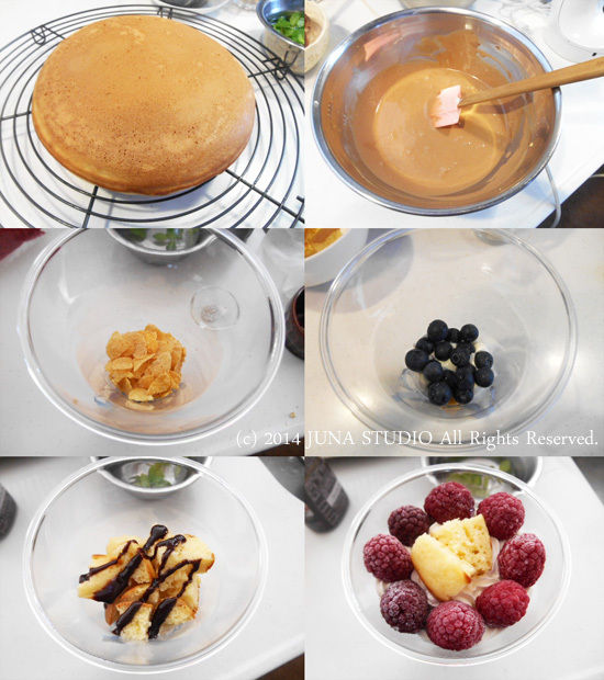 ガラスボウルにはいってるのは、↓ホットケーキを分厚く焼いて切ったもんです。
