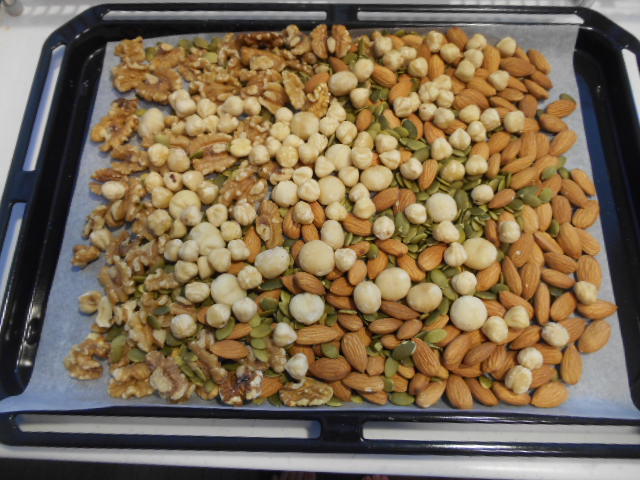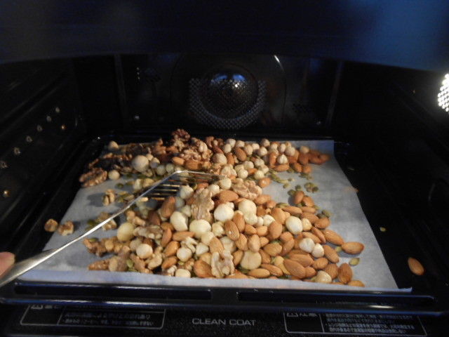 あとは、天板にオーブンペーパーを敷いて、ナッツ類をお好みの量、ダーーーーーッと。