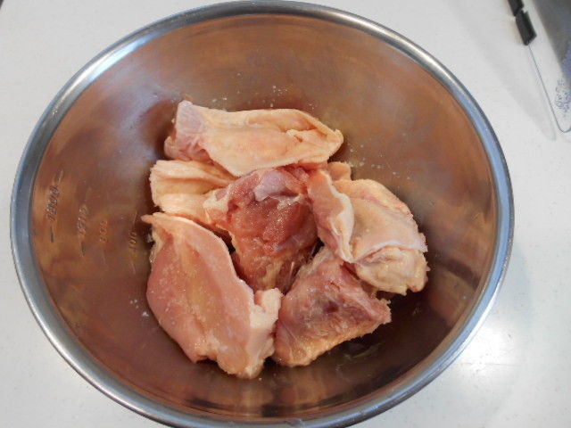 1.鶏肉は1枚を3分割して2枚で計6個にし、ボウルに入れて多めに塩をまぶし、