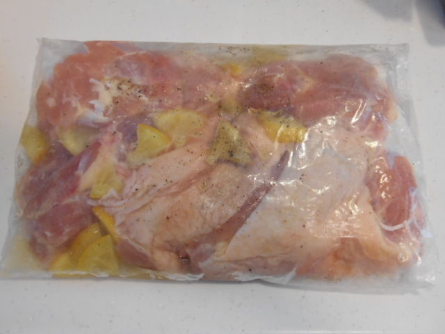 鶏肉をレモン塩のエキスと塩漬けになったレモンなどで作った調味液に漬けこみ、