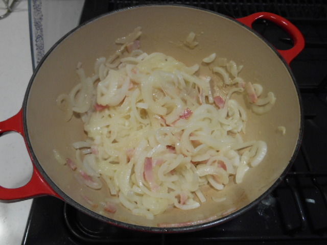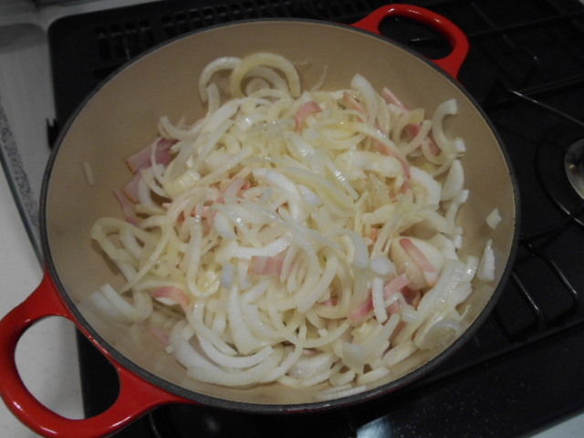 2.鍋にオリーブオイルを多めにひき、1のタマネギとベーコンを中火で炒める。