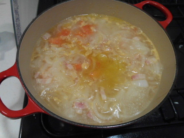 水、1のトマト、固形コンソメを入れて強火にする。