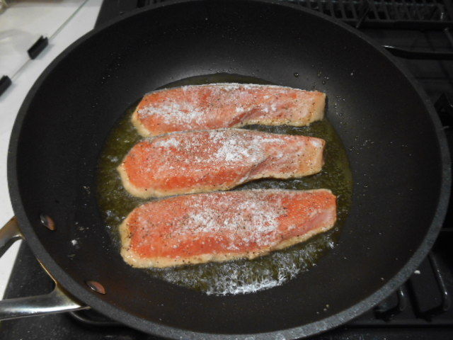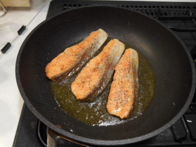 3.鮭は取り出して皿に盛りつけ、フライパンの油をざっとすてたら、