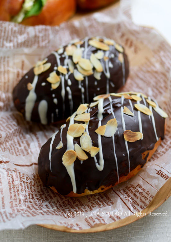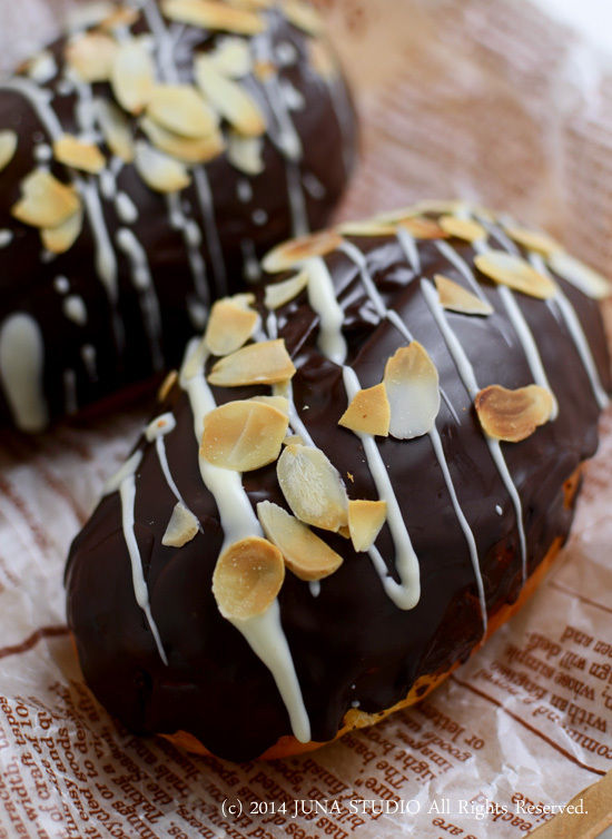 ホワイトのコーティングチョコをかけ、ローストしたアーモンドをパラパラと。