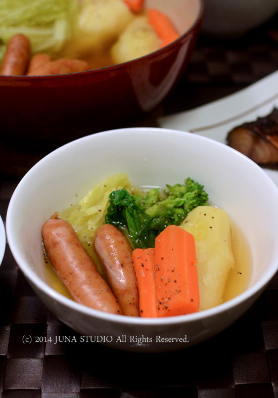 具は、タマネギ、にんじん、白ねぎ、キャベツ、菜の花、じゃがいも、ウインナー