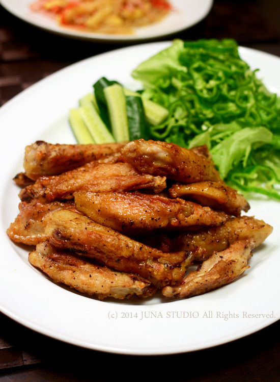 手羽中に塩・コショウをしてから片栗粉をまぶし、多めの油で両面カリッカリになるまでソテー。