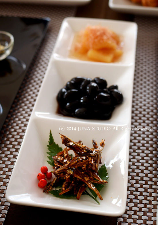 こちらでは、田作り、黒豆、かずのこの3種が祝い肴になります。