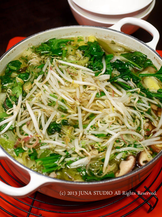 白菜、白ねぎ、しいたけ、さつまいも、大根、もやし、ほうれん草、豚肉、
