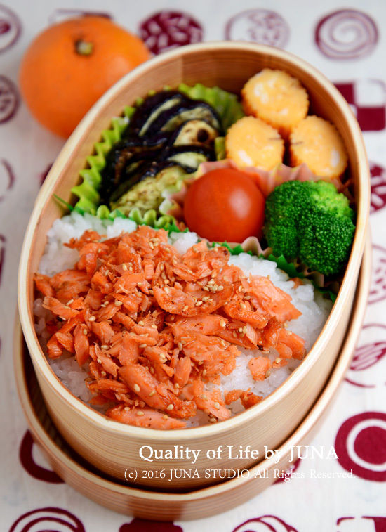 ほぐした鮭をさっと炒めてしょう油少々で香りづけし、七味唐辛子+白ごまを加えて