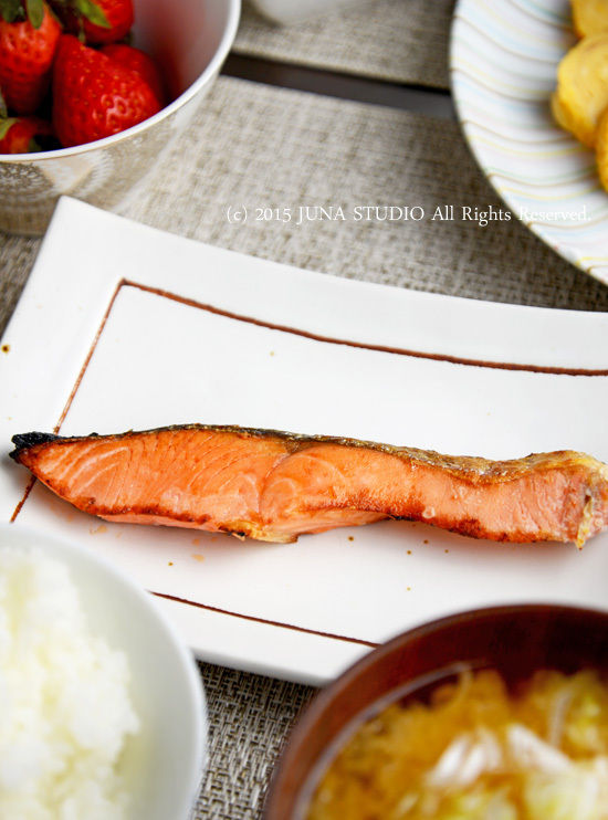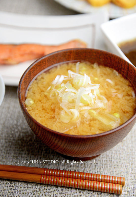 細切りにした大根&じゃがいも+白ネギでちょっと濃いめのおみそ汁を。